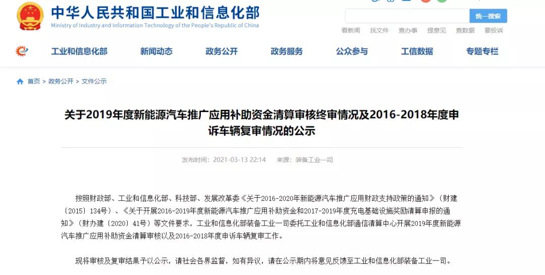 近日,工信部正式對外發布關于2019年度新能源汽車推廣應用補助資金清算審核終審情況及2016-2018年度申訴車輛復審情況的公示。
