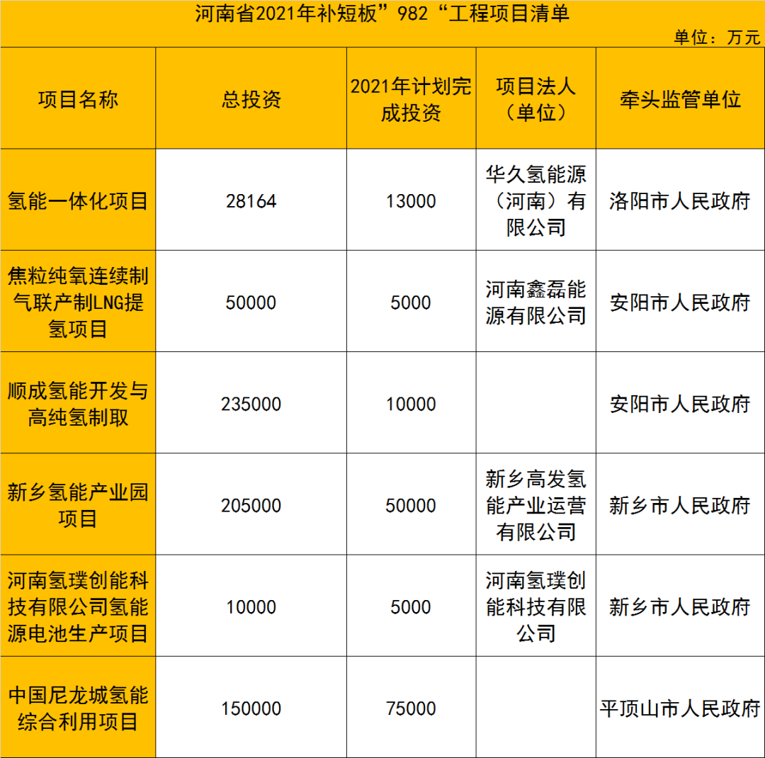 此次《河南省2021年補短板“982”工程實施方案》項目清單中,6個氫能與燃料電池項目被選中,總投資67.82億元,2021年計劃完成15.8億元投資。