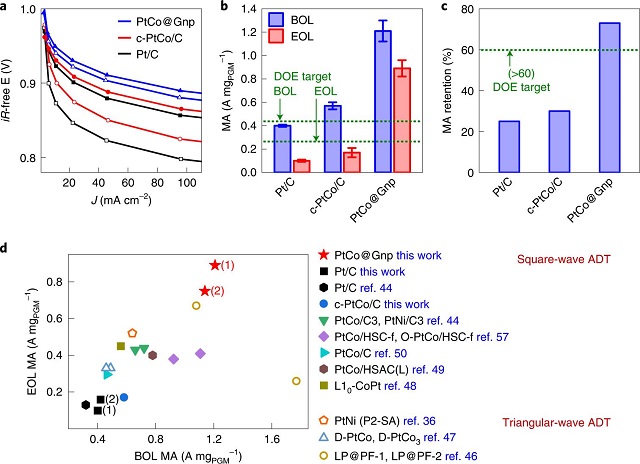 圖2. Pt/C,c-PtCo/C和PtCo@Gnp催化劑的MEA性能和文獻中具有代表性的催化劑對比。