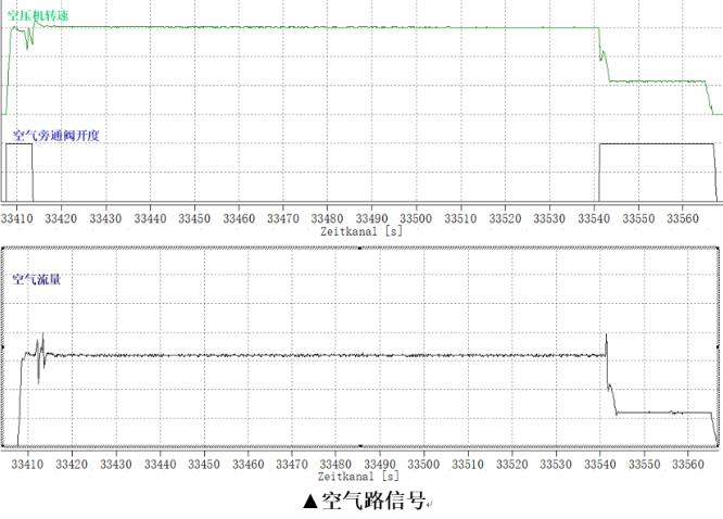 數(shù)據(jù)顯示,在車輛喚醒后進(jìn)行了3個(gè)階段的吹掃,分別是管路-電堆-管路,且每個(gè)階段的空氣流量都不同,其中電堆內(nèi)的吹掃時(shí)間最長(zhǎng),占比77%,吹掃完電堆后對(duì)管路進(jìn)行了一個(gè)簡(jiǎn)短且較低流量的吹掃。